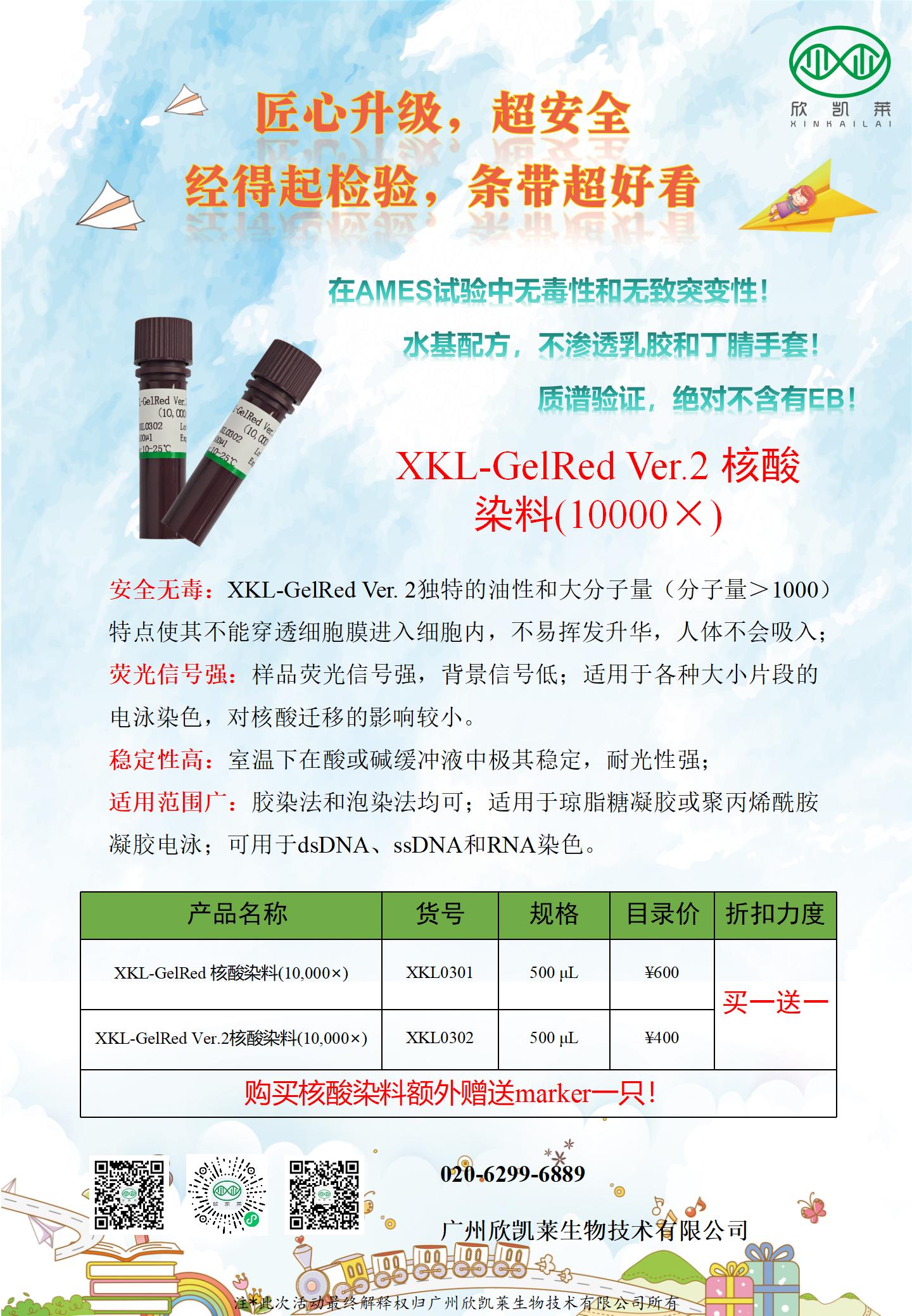 新品!新品!新品!XKL0302,重磅来袭,Gelred无毒核酸染料升级版来了,AMES试验中无毒性和无致突变性,清华大学做了质谱鉴定,gelRed分子量为1239,不会渗入细胞膜里。现在咨询有好价!