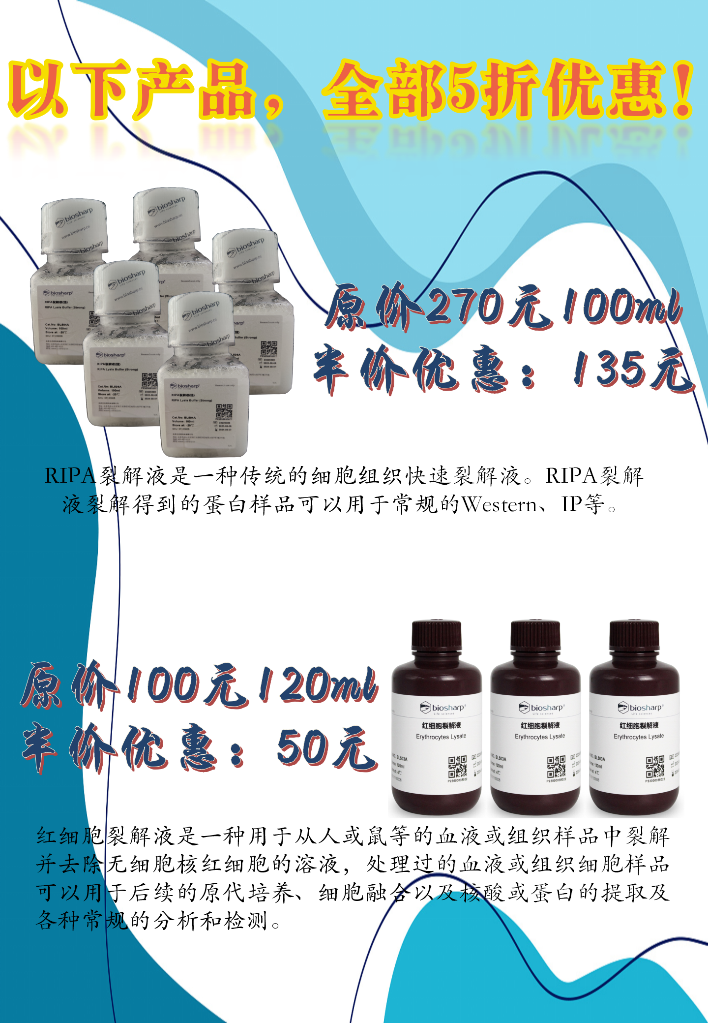 白鲨 RIPA 裂解液和红细胞裂解液 ,每瓶仅需一半价格,就能享受到整瓶的量,降价不降量!