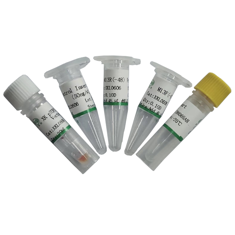 XK pTOPO-TA/Blunt Simple Cloning Kit利用痘苗病毒的拓扑异构酶I (Topoisomerase I)的切割再连接的特点将片段克隆到载体中。不仅适用于克隆由PfusPfuKODXeroxPhusion Q5 等高保真DNA聚合酶扩增的平末端PCR产物,也可克隆由TaqTaqplusTthklenTaqDNA聚合酶扩增的带A尾的PCR产物。试剂盒中的pBM23载体为线性化的质粒。可以用引物M13F (-47)M13R(-48)进行菌落PCR鉴定阳性克隆。载体不含LacZ基因,不能进行蓝白斑筛选。