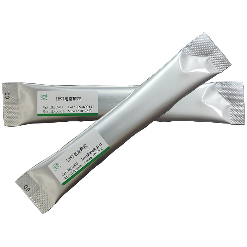 TBST为白色至类白色速溶颗粒,每袋 TBST 速溶颗粒可配制1L 1× TBST 缓冲液,操作简便,使用方便。 TBST的主要成分是氯化钠、氯化钾、Tris 缓冲盐和 Tween-20,1× TBST缓冲液中含有的氯化钠浓度为137 mM、氯化钾的浓度为2.7 mM,Tris缓冲盐的浓度为25 mM,Tween-20的含量为0.05%。